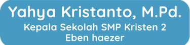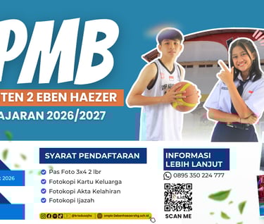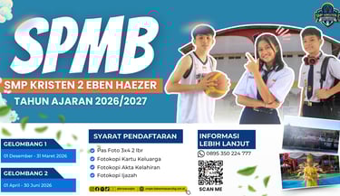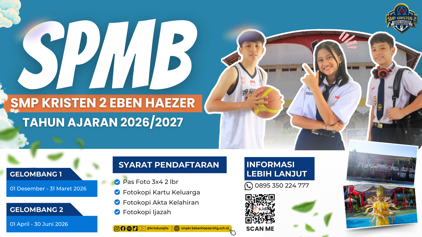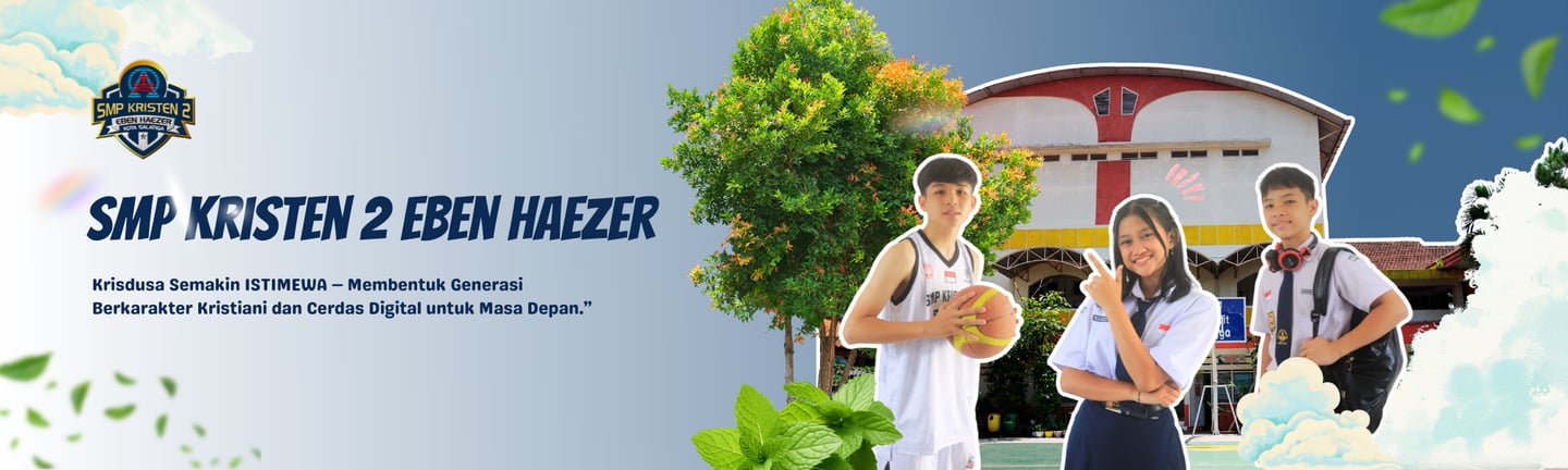 SMP Kristen 2 Eben Haezer adalah lembaga pendidikan yang berkomitmen membentuk generasi yang berkarakter, beriman, dan berprestasi melalui pembelajaran yang inovatif. Dengan slogan “Krisdusa Semakin ISTIMEWA”, kami terus mengembangkan kualitas pendidikan melalui integrasi teknologi digital dalam proses belajar mengajar. Dengan dukungan tenaga pendidik yang profesional serta lingkungan belajar yang positif, SMP Kristen 2 Eben Haezer berupaya menciptakan peserta didik yang unggul secara akademik, berkarakter Kristiani, dan siap menghadapi tantangan masa depan.